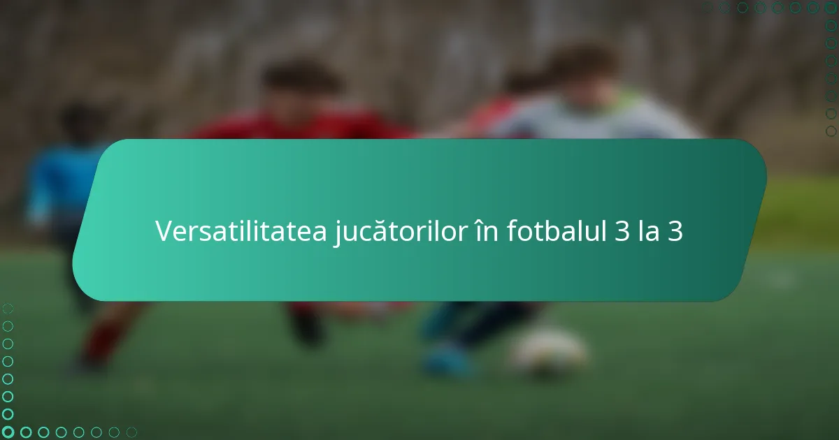 Versatilitatea jucătorilor în fotbalul 3 la 3 este determinată în principal de adaptabilitate, abilități multifuncționale, comunicare eficientă și trăsături fizice specifice. Aceste abilități permit jucătorilor să îndeplinească diverse roluri pe teren, îmbunătățind dinamica echipei și performanța generală.
